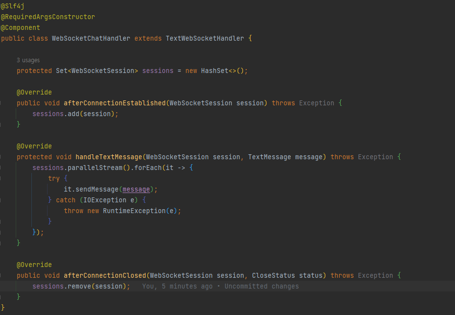웹 소켓 핸들러를 등록했고 처음 연결이 접속되면 세션을 Set을 통해 관리하고 간단하게 메세지를 현재 접속된 유저들에게 보내는 방식으로 등록했다.