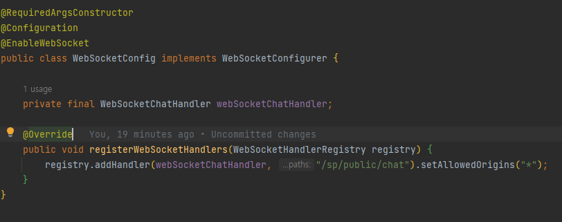 WebSocketConfigurer를 implmenets하여 핸들러 등록 path 설정을 진행했다 간단한 테스트 용도로 origins는 모두 허용해서 처리했다.
