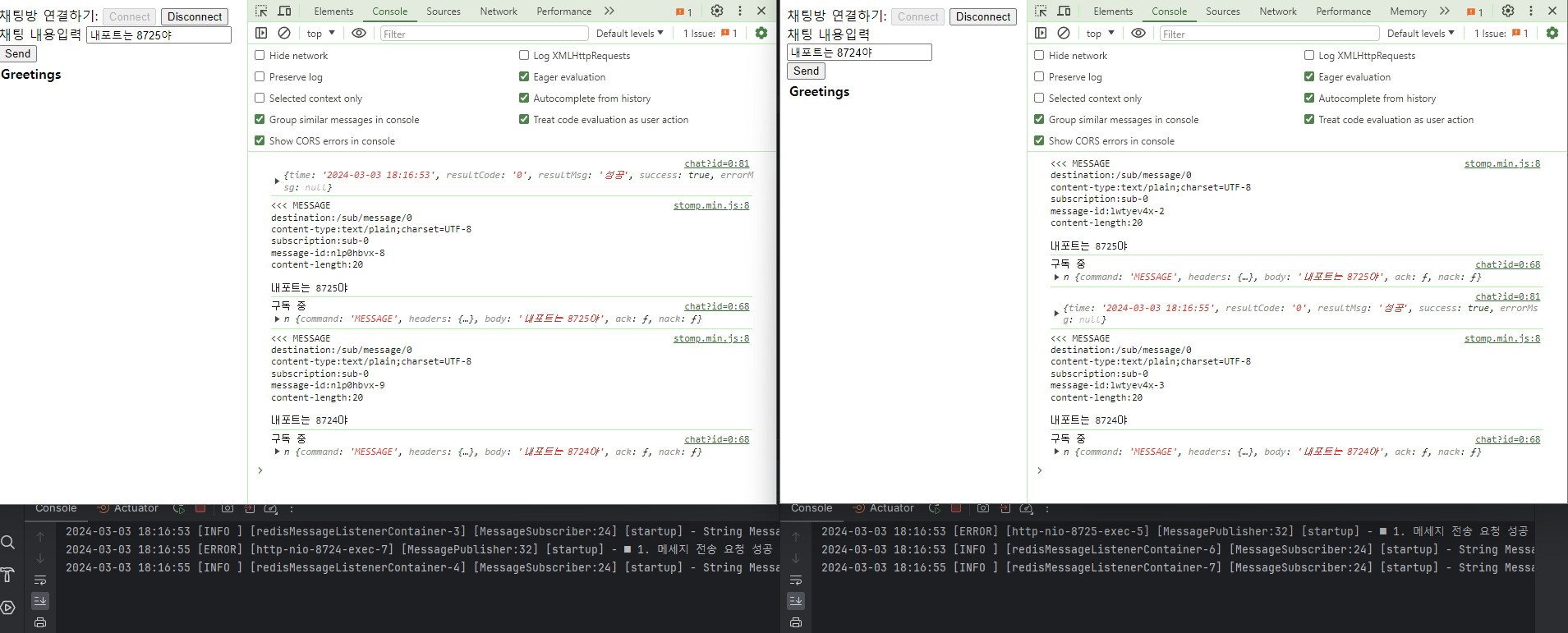- 이후에 두개의 다른 포트서버를 띄워두고 각 서버에 요청을 날리면 모두 공유되게 채팅이 발생될 수있는지 테스트 진행하였으며, 동작이 되는것을 확인했다. 아직은 간단하게 사용하여 테스트 정도만 진행했고 이제는 하나씩 찾아보면서 진행할 예정이다.