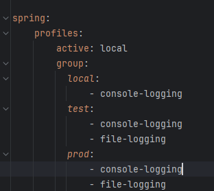 위 처럼 spring profile에 콘솔(console-logging), 파일(file-logging)과 같은 두가지 상태의 모듈을 만들었다 생각하면 된다.
