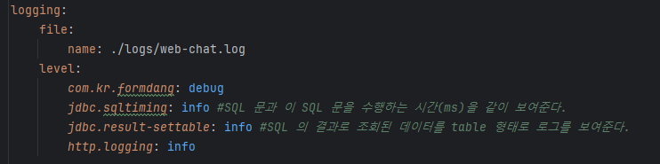 현재 구성하고있는 채팅 서버는 부트로 구현하고 있으며 이전에는 application.yml에 간단하게 설정하여 로그를 진행하였다.