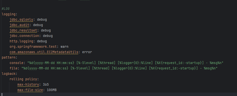 <property name="FILE_LOG_PATTERN" value="%d{yyyy-MM-dd HH:mm:ss} [%-5level] [%thread] [%logger{0}:%line] [%X{request_id:-startup}] - %msg%n"/>