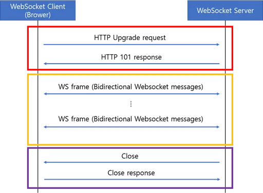 - 위 과정을통해 프로토콜 ws, wss(WebSocket)으로 변환되어 frame을 사용하여 데이터를 교환한다.