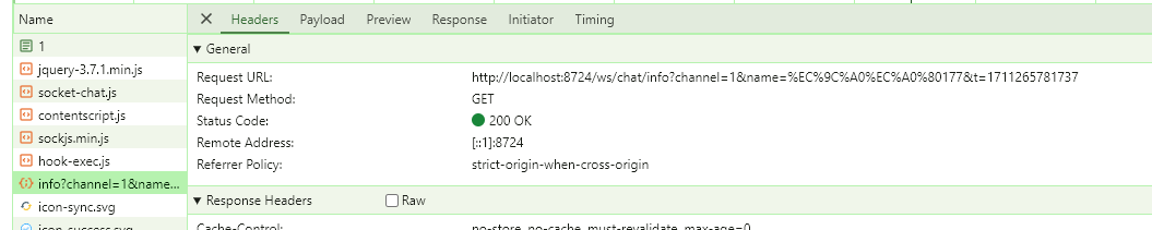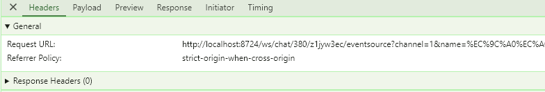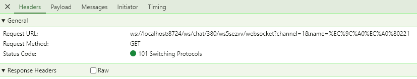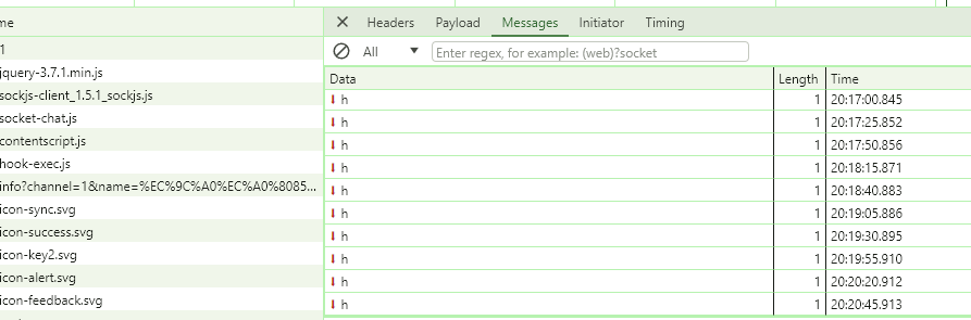 - 개발자도구 - 네트워크 - WebSocket - Message 탭을 눌러보면 WebSocket의 메세지가 나오는데 25s마다 h 문자가 하나씩 찍힌다.