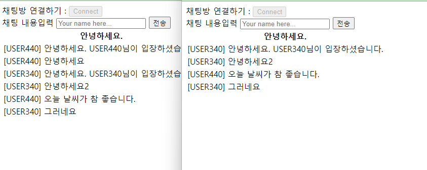 위처럼 두개의 소켓 연결을 통하여 유저 대화 테스트를 진행했다.