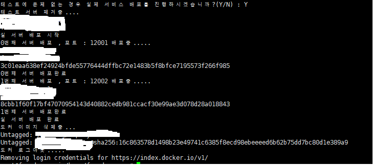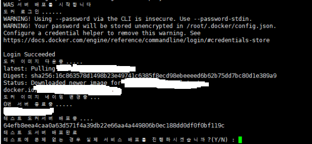 테스트 도커 컨테이너를 띄우게 되고 해당 테스트를 진행한다. 만약 문제가 없으면 Y를 입력해준다. (N인 경우 중지시켰던 컨테이너를 다시 시작하고 테스트 컨테이너를 지운다)