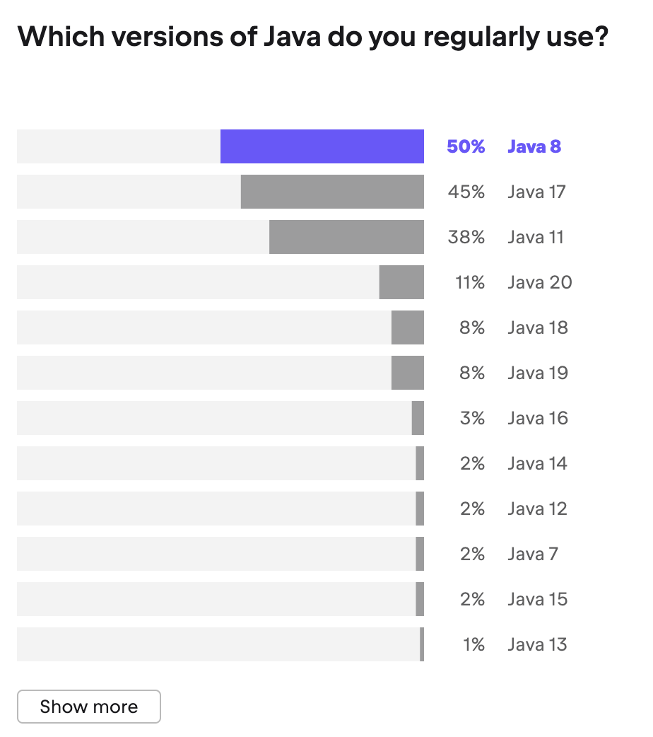 해가 지날 수록 Java 8에서 java 17로 사용량이 변화되고 있는것으로 보이며 java 17의 사용량은 이전 LTS버전인 11보다 급격히 증가하고 있습니다.