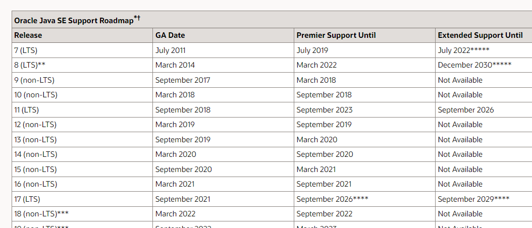 아래 표를 보면 java 8이 가장 서포트 기간을 가지고 있으나, 11보다 17의 버전의 서포트 기간이 길며 이는 버전 변경에 17이 우위를 가질 수 있는 장점이 됩니다.