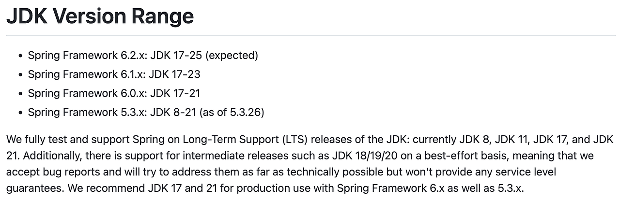 ※ 현실적으로 버전 업그레이드가 어려운 경우는 최소한 java 8로는 진행하여 사용하는것을 권장한다. 이는 java 8부터 지원되는 람다, 함수형 인터페이스, 스트림 등의 다양한 기능을 포기하는것이다!