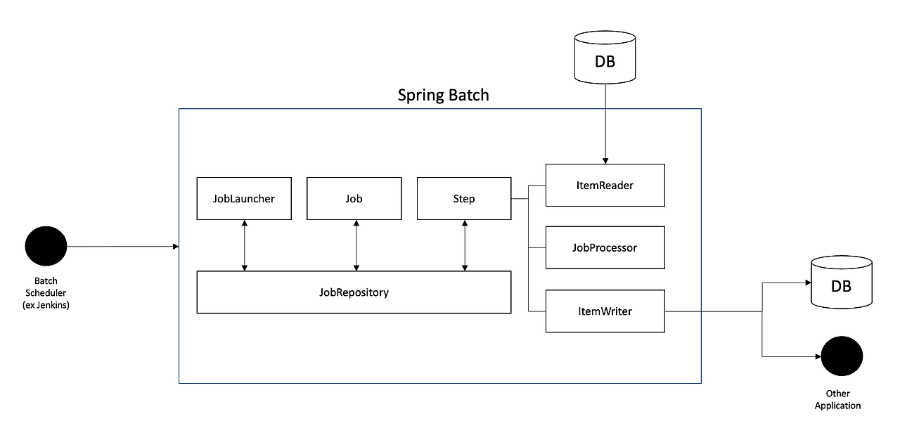 스프링 배치(Spring Batch) 위와 같은 아키텍쳐 구성을 가지고 있습니다.