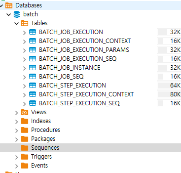 스프링 배치는 배치 작업의 상태를 관리하기 위한 메타 데이터를 저장하는 아래 6개의 테이블들을 자동으로 생성합니다. 또한 배치 작업을 수행하면 자동으로 생성된 테이블들의 컬럼 값들이 채워집니다.