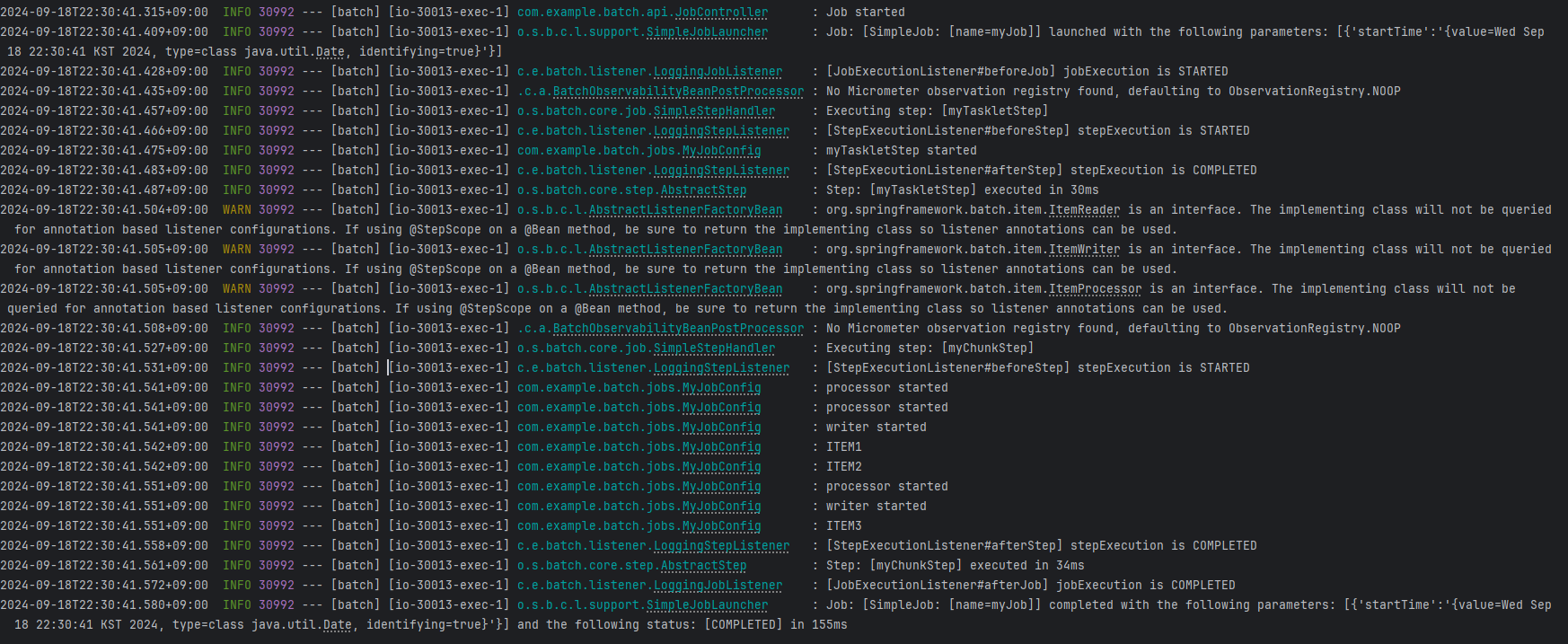 Job이 정상적으로 수행되고 chunk 단위로 쪼개어서 처리되는것을 확인 할 수 있었습니다. 기본적인 배치 구조를 작성해보았으며 다음 포스팅에서는 데이터베이스 데이터를 이용하여 처리 후 장애 상황까지 재연해보겠습니다.