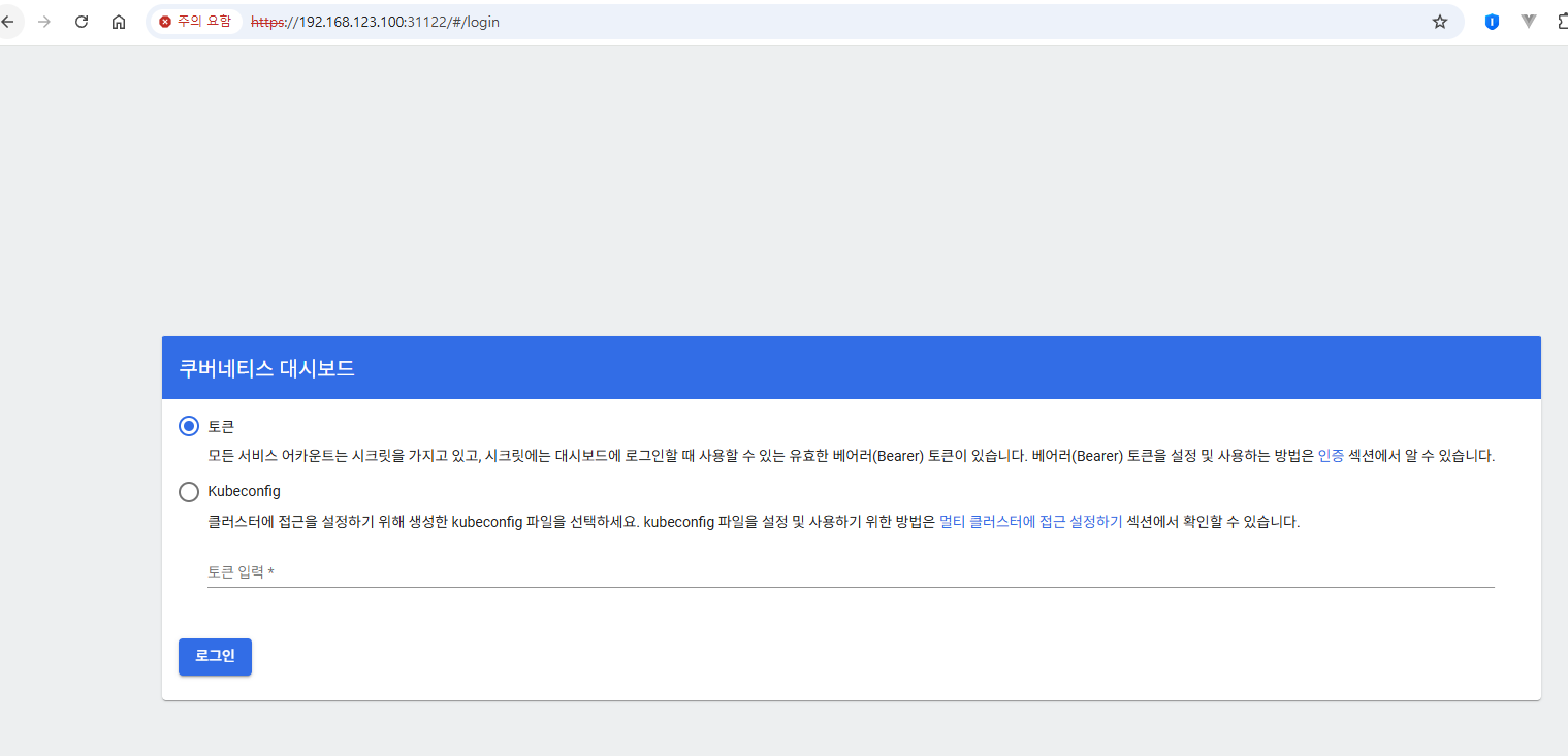 이제 https://{ip}:{nodePort}/#/login으로 대시보드 페이지를 접근할 수 있습니다.