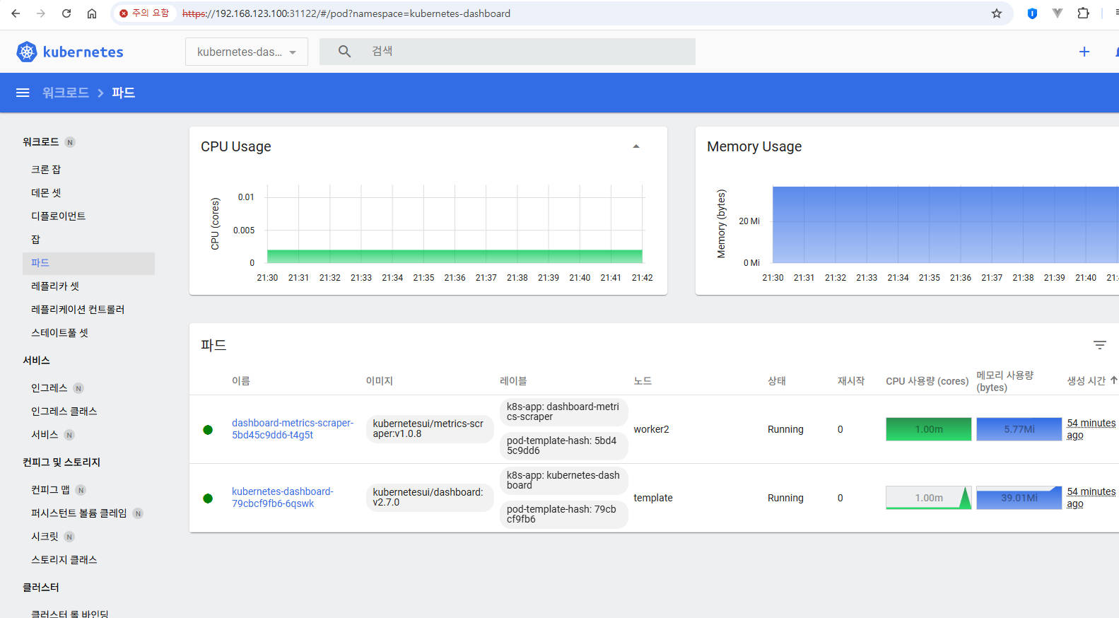 이제 쿠버네티스 대시보드를 접근할 수 있게 되었으며 현재 다른 pod를 띄우지 않은 상태인 경우 네임스페이스를 대시보드로 가게 되면 대시보드 파드들이 생성되어 동작하고 있는 것을 볼 수 있습니다.